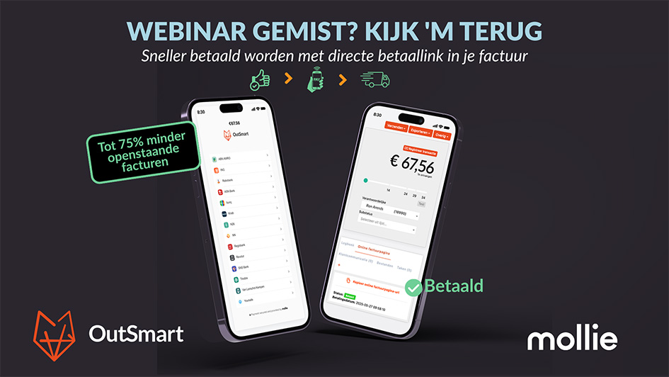 Wil je als ondernemer of bedrijf sneller betaald krijgen en minder tijd besteden aan administratieve handelingen? De nieuwe koppeling tussen OutSmart en Mollie brengt deze wens in vervulling. Tijdens onze recente webinar hebben we laten zien hoe deze integratie werkt en welke voordelen dit oplevert voor jouw bedrijf.